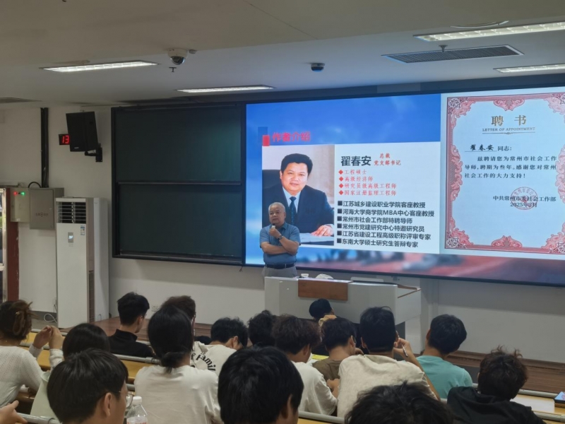为深化产教融合,培养适应市场需求的高技能人才,10月9日,管理工程学院面向2025级工程造价和建设工程管理专业全体新生开展“企业专家进课堂——入学教育专业引领”活动。学院客座教授、江苏安厦工程项目管理有限公司总裁兼党支部书记翟春安应邀作“放飞梦想,成就未来”主题讲座。