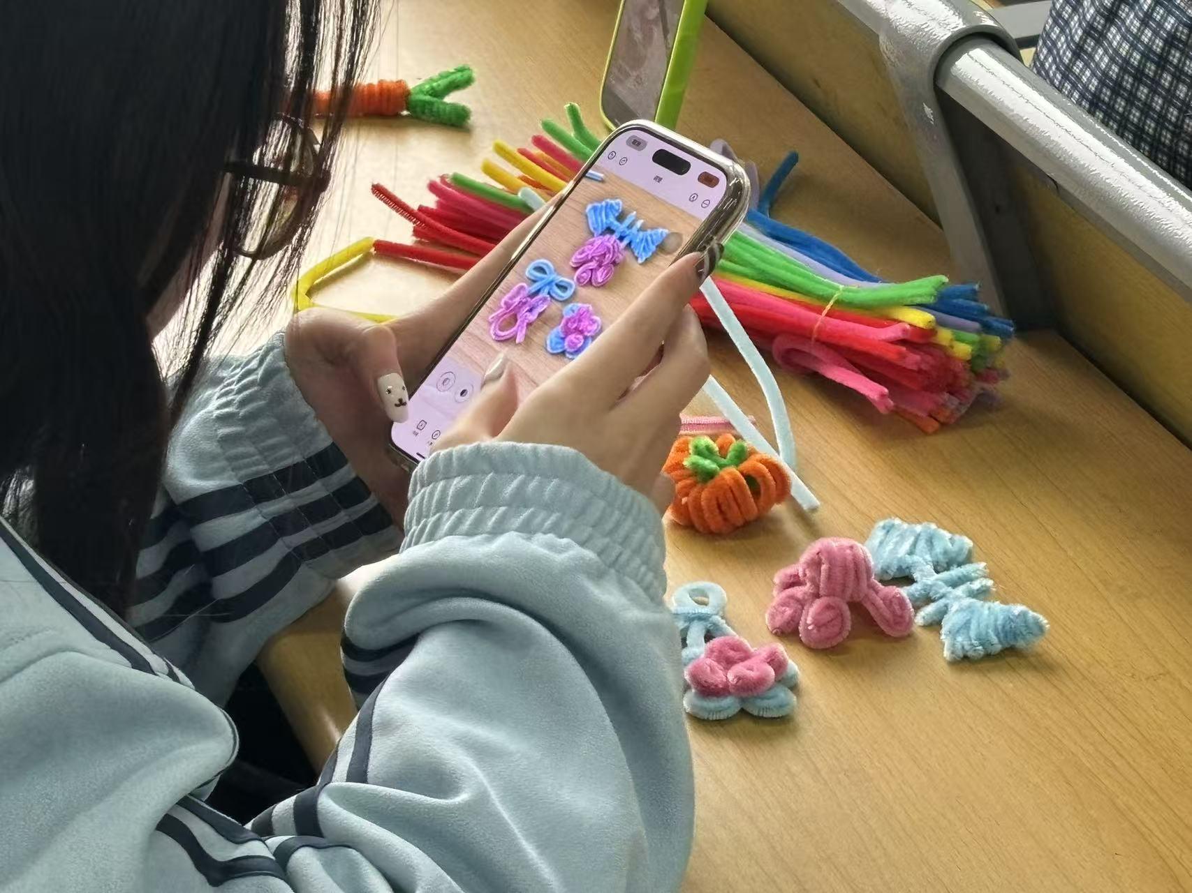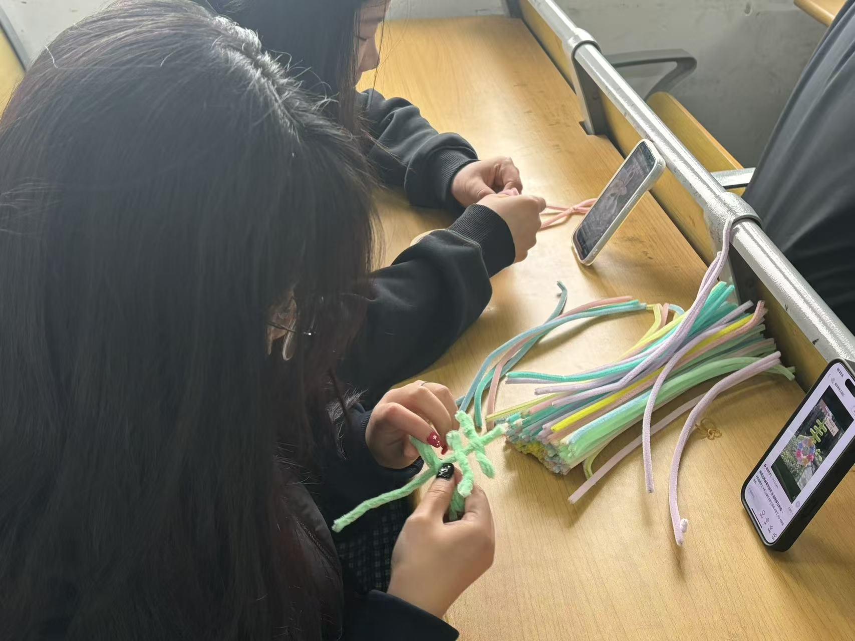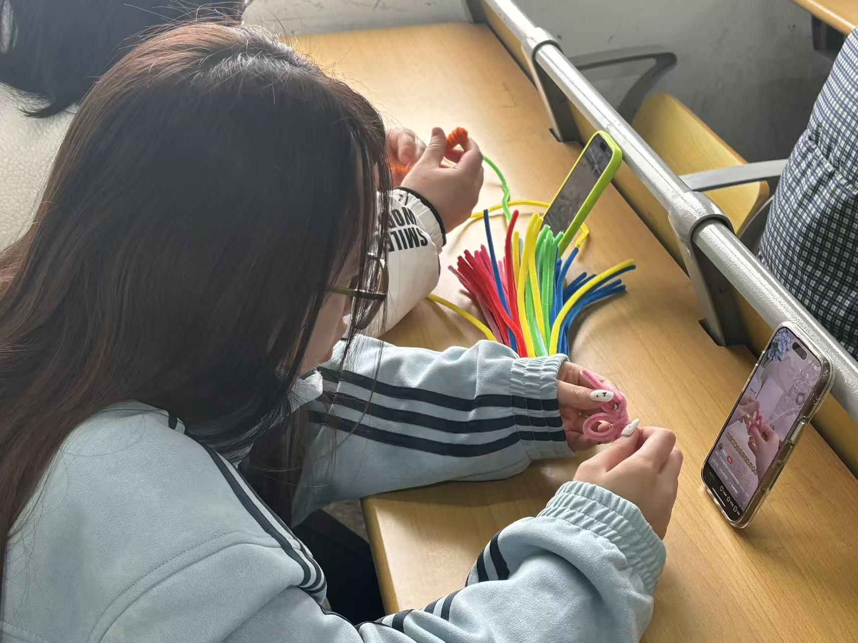 进入自由创作环节,同学们充分发挥想象力,用五彩的扭扭棒制作花朵、挂件、小动物等作品。志愿者穿梭其间,一对一、手把手进行指导,在协助创作的同时,与大家亲切交流、倾听心声,用陪伴传递温暖。一双双巧手翻飞,一根根绒棒变幻,现场欢声笑语不断,温情在指尖流淌。